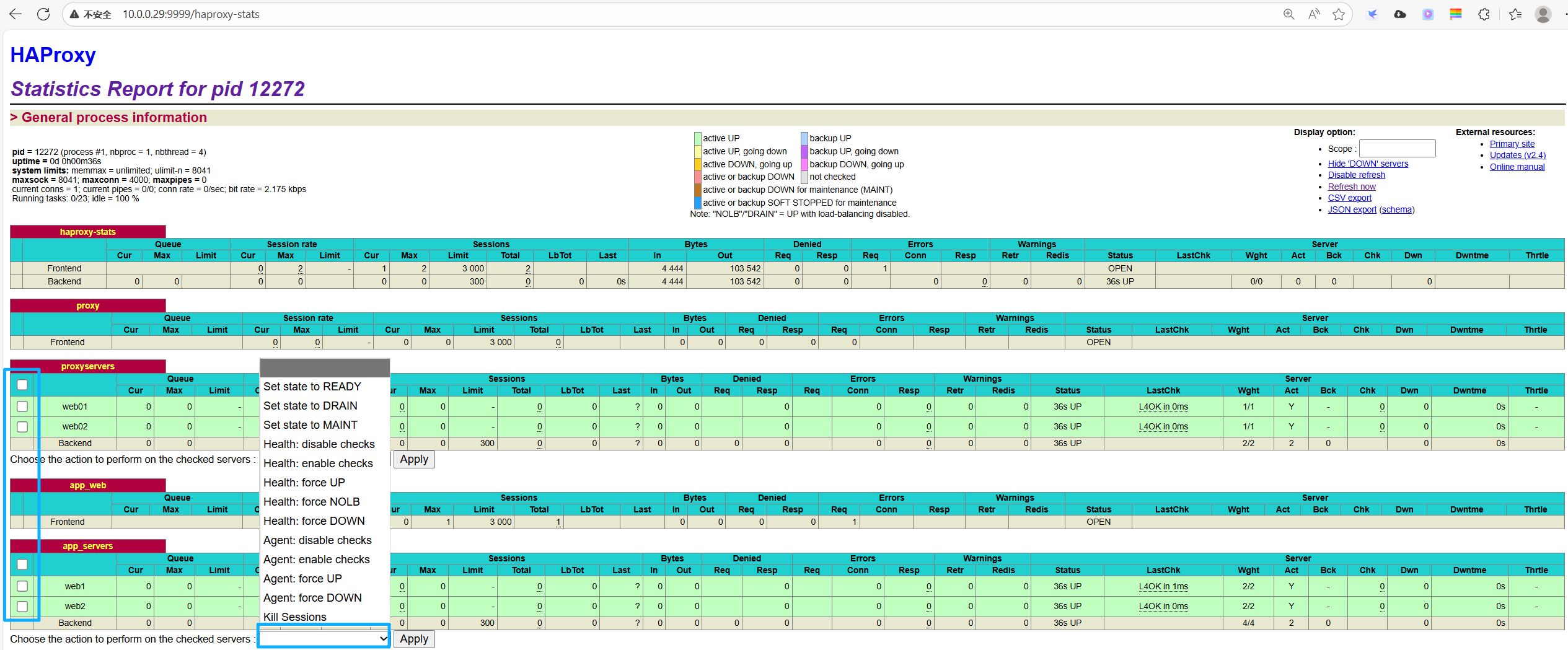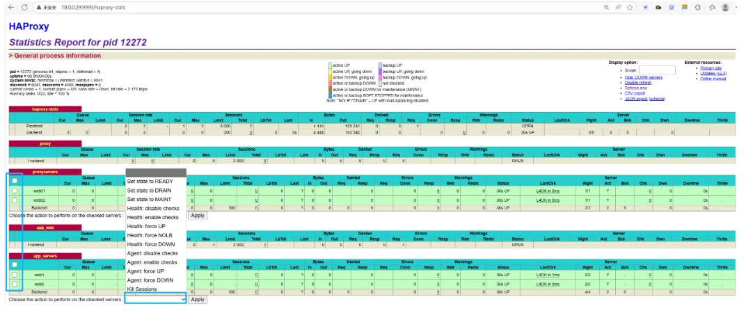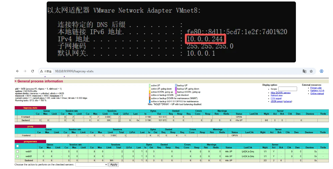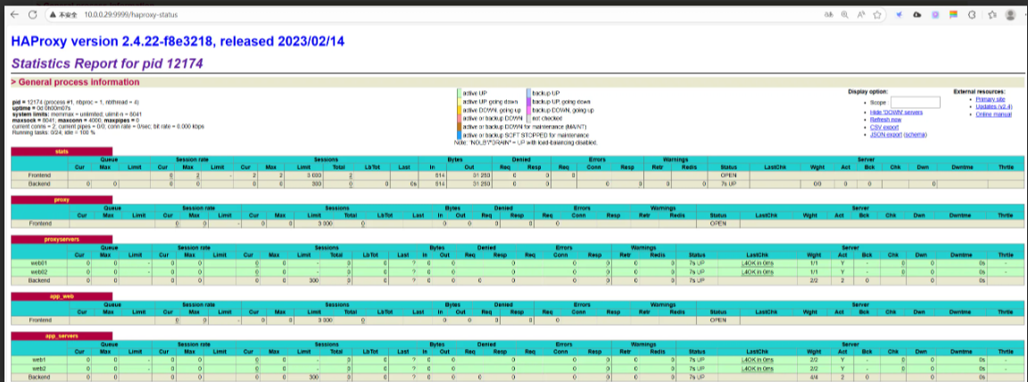 root 22571 12441 0 21:24 pts/1 00:00:00 grep --color=auto haproxy8、验证Haproxy,使用浏览器访问: http://haproxy-server:9999/haproxy-status