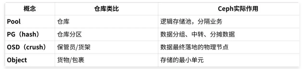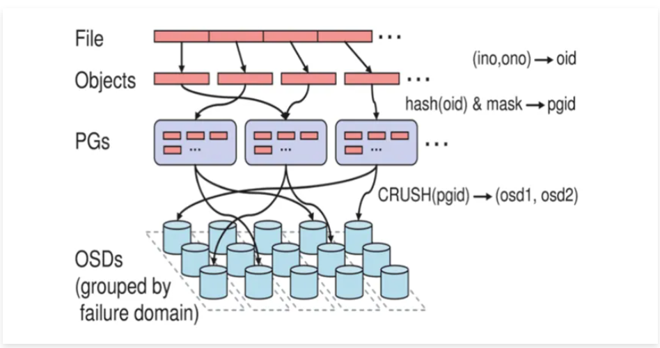 Ceph OSD(Object Storage Device): 功能是存储数据,处理数据的复制、恢复、回填、再均衡,并通过检查其他OSD守护进程的心跳来向Ceph Monitors提供一些监控信息