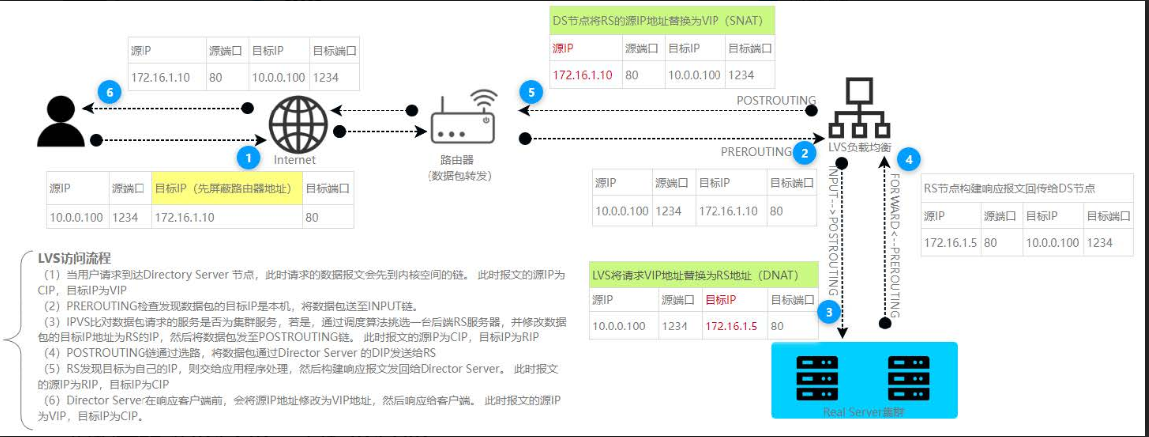 通过修改请求报文的 目标IP 地址,而后根据调度算法挑选出⼀台 RS 节点进行转发。