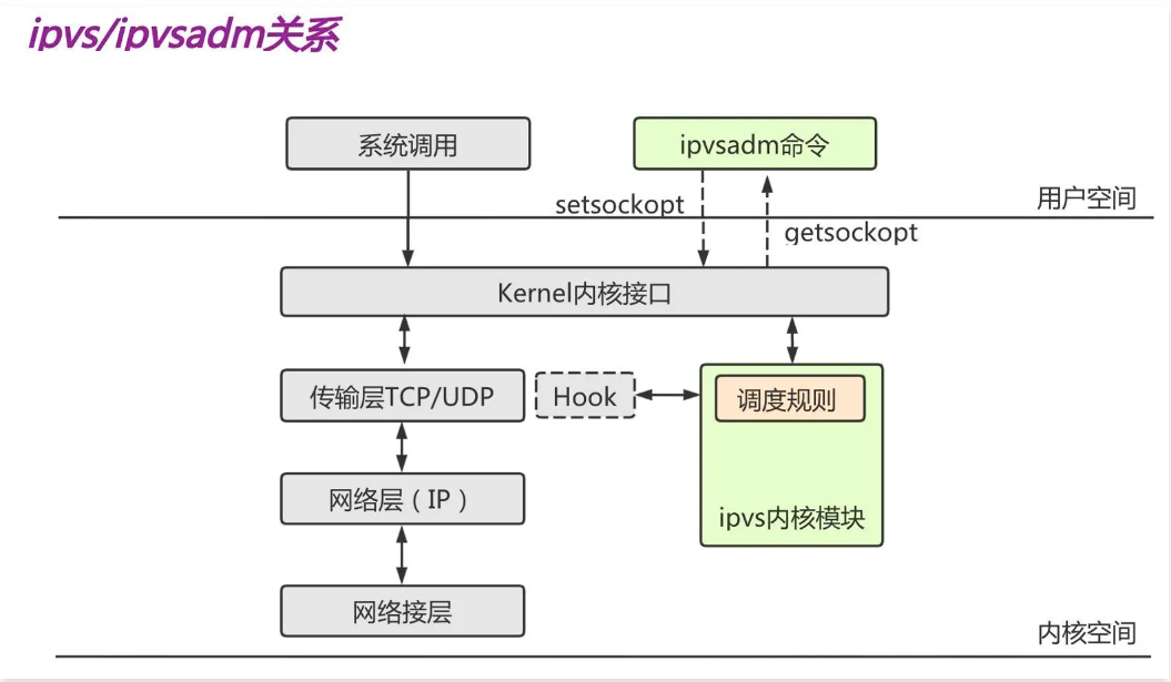 ipvs :⼯作在内核空间,实现集群服务的”调度“,借鉴了 iptables 的实现方式